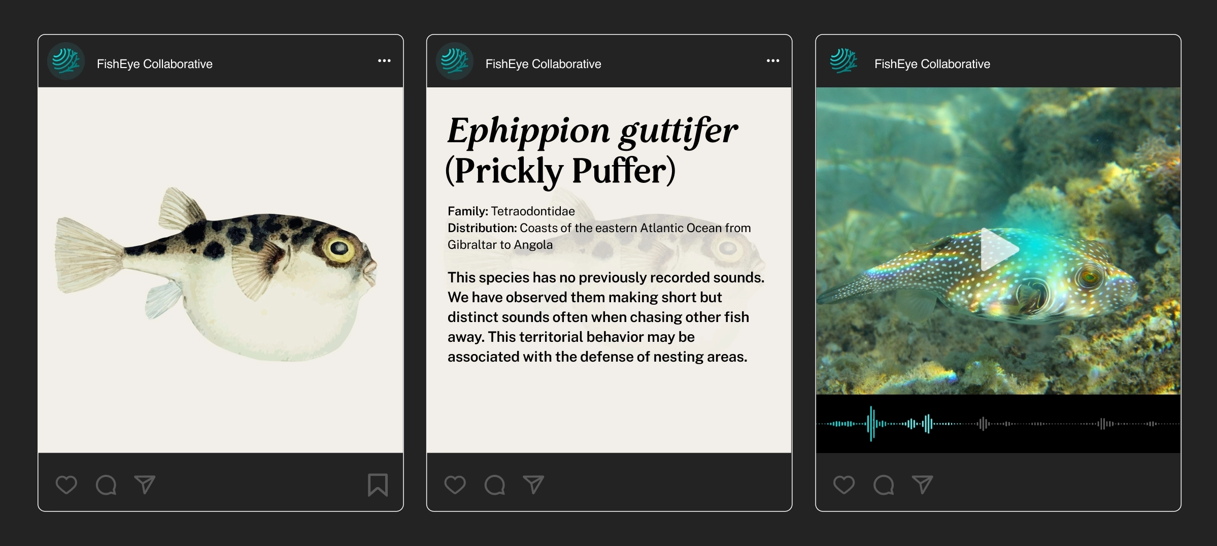FishEye Collaborative is an emerging conservation technology non-profit specializing in marine conservation bioacoustics. They do research and development on non-invasive listening technologies that can help evaluate and protect ocean habitats. Their collaborators include the Cornell University Center for Conservation Bioacoustics, the Smithsonian National Museum of Natural History, the FORTH Institute, and the Curaçao Sea Aquarium and Substation. An inaugural website and brand identity was developed to support their first scientific publication and to introduce them to the public.
