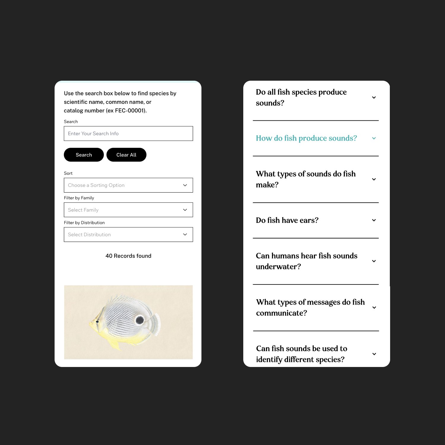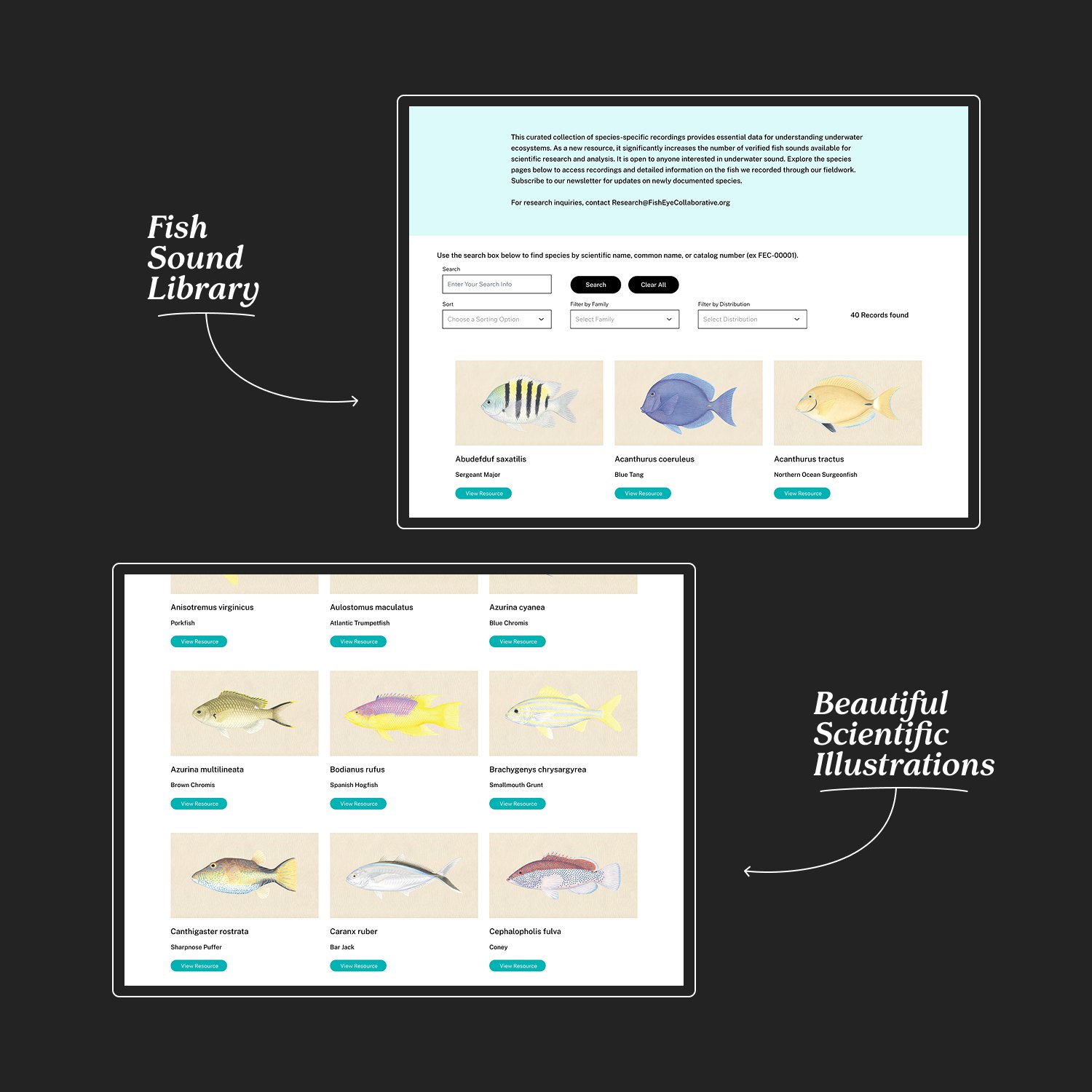 A modern website, including a fully searchable and browsable fish sound library microsite, was designed and developed. Additionally, a social suite was created to help showcase the work of the organization and make the scientific findings approachable and fun.