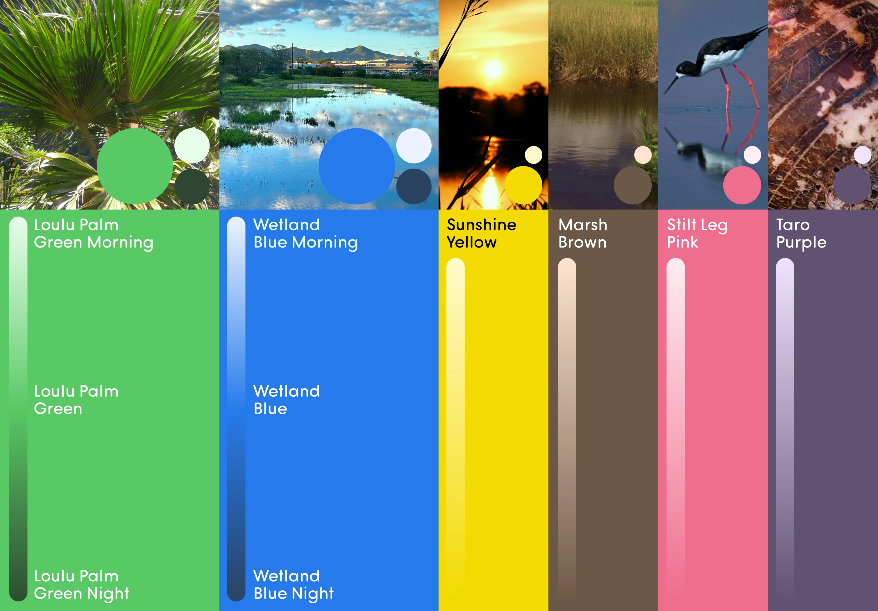 A full brand guide was created to outline the new logo family, color system, and fonts. Further guidance was given on ways the Loulu palm silhouette could be used to crop photos, create patterns, and extend the brand through depth and continuity.